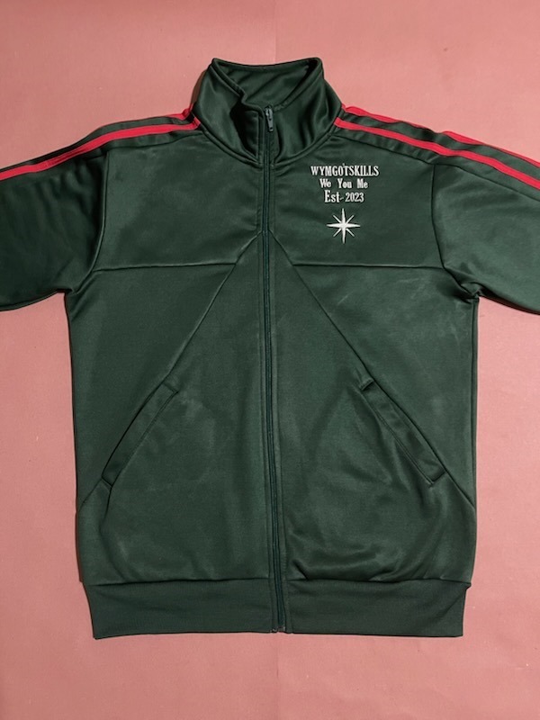 Step up your style with the WYMGOTSKILLS Signature Track Jacket. This Forest Green jacket combines a sporty look with clean, modern details. It has triple bold Red stripes on the shoulders and a White panel on the sleeves for a classic, standout look.