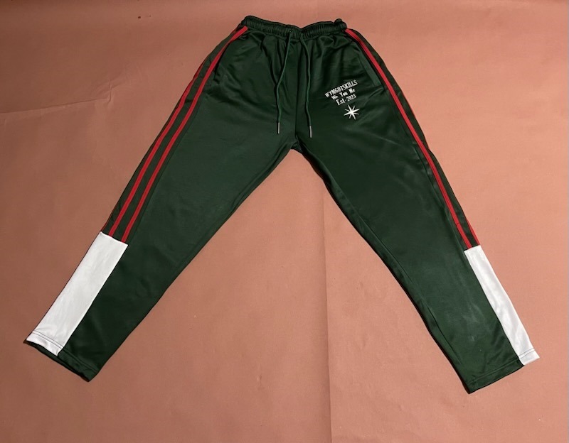 Stay comfortable and stylish with the WYMGOTSKILLS Track Pants. Made in deep Forest Green with Red stripes down the sides and a White panel near the cuffs, these pants give off a cool, streetwear vibe.